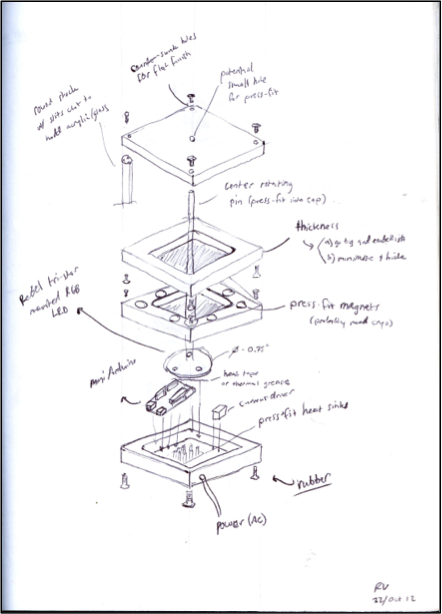 The TwistLamp is comprised of two similar cube-shaped structures, each with an RGBLED array. The interface between the cubes is designed to accommodate one full rotation of the top half without damaging wire connections and uses a magnet-detent feature for tactile feedback. A central threaded rod spins along with the top half and controls a potentiometer in the base to change the light color. A mechanical stop in the interface prevents over-rotation.